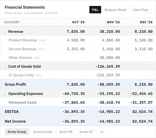 Purpose-built for consolidation, variances, and reporting. Understands your P&L natively.