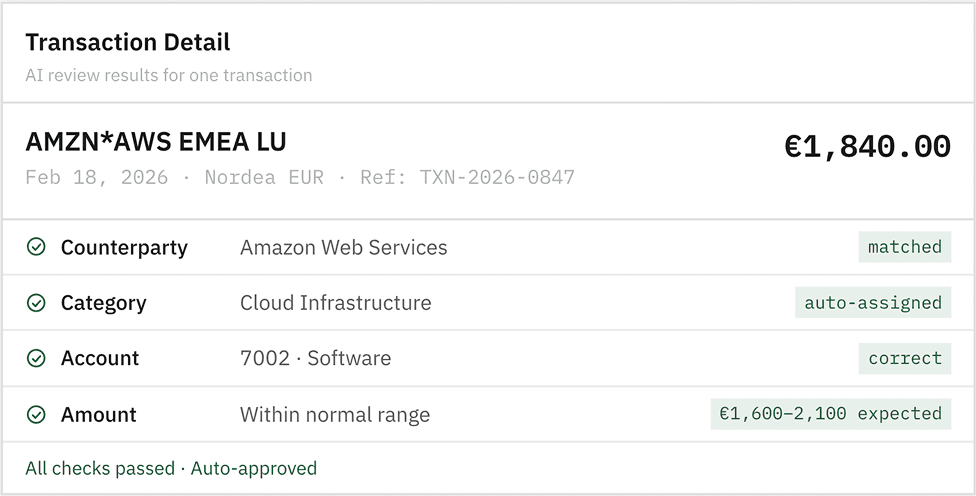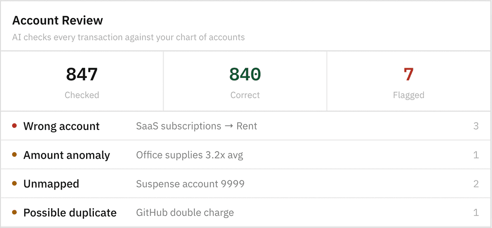 The AI checks every transaction against your chart of accounts and flags anything that doesn't fit. Problems are caught at the transaction level, before they compound into closing errors or audit findings.