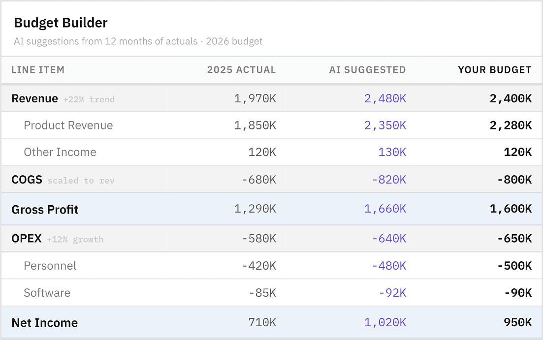 Start from your historical actuals, not a blank spreadsheet. AI suggests budget lines based on your real financial data: trends, seasonality, growth rates. Adjust from there.