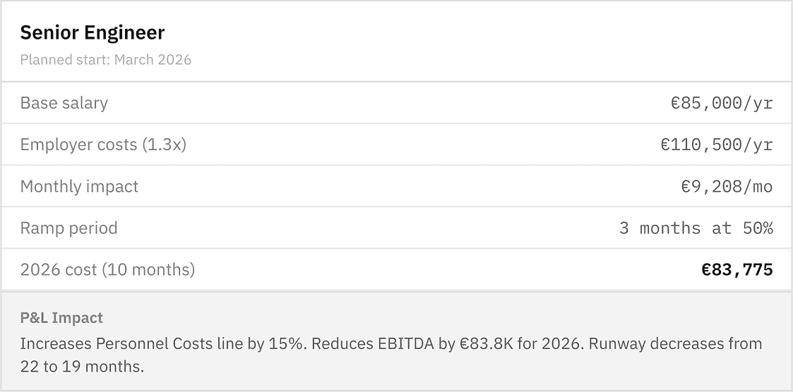 Headcount is usually the biggest line item, and the hardest to budget. Model hiring timelines, salary costs, and ramp periods. See the P&L impact before you open the role.