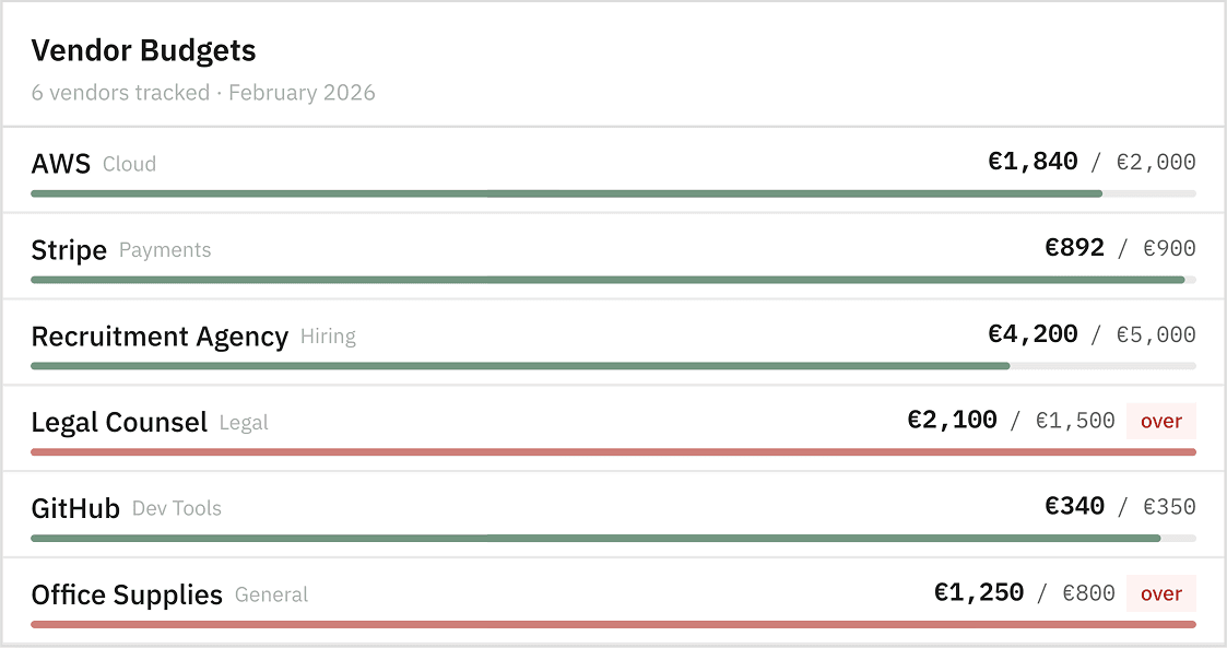 Some budgets make more sense at the vendor level. Set a budget for AWS, for your recruitment agency, for that consulting contract, and track actuals against it automatically as transactions flow in.