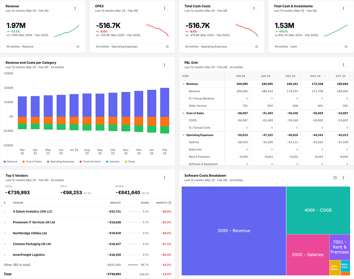 Most financial dashboards look like they were built by engineers. Ours are built for the people who present to boards and investors. Clean, dense, and opinionated, every chart and table is designed to tell a story. AI runs underneath, keeping everything current and surfacing what matters.
