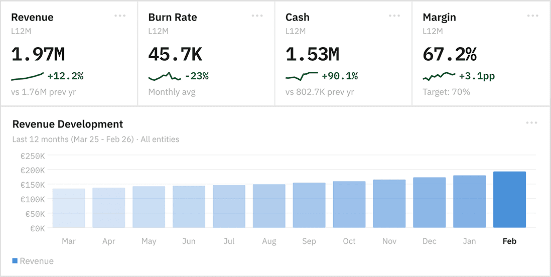 Revenue, burn rate, cash position, margins. The numbers your CFO checks first, ready the moment you open the dashboard. Pre-built financial widgets pull from your live data. No clicking through five tabs, no waiting for a refresh.