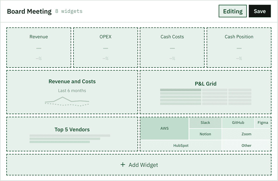 Build dashboards that match how each stakeholder thinks. One view for the weekly standup, another for the board, another for the investor update. Combine charts, statements, and KPIs freely. Save each layout and it's ready next month. No rebuilding, no reformatting.