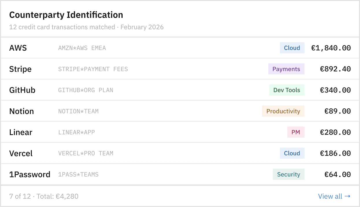 It identifies counterparties behind credit card transactions automatically, so you see exactly which tools your company is paying for and how much each one costs. No more digging through bank feeds line by line.